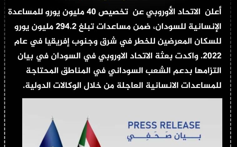 أعلن الاتحاد الأوروبي عن تخصيص 40 مليون يورو للمساعدة الإنسانية للسودان، ضمن مساعدات تبلغ 294.2 مليون يورو للسكان المعرضين للخطر في شرق وجنوب إفريقيا في عام 2022.