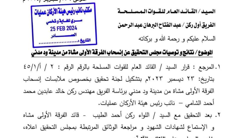 الجيش ينفي ما تم تداوله حول نتائج التحقيق مع قائد الفرقة الأولي ود مدني