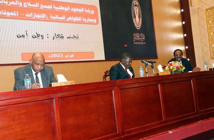 من جانبه قال الفريق ركن دكتور عبد الهادي عبد الله عثمان أن انتشار السلاح العشوائي يعد أبرز مهددات الأمن والسلام بالبلاد حيث يساعد في الاتجار بالبشر وتجارة المخدرات والتهريب والحروب القبيلة، كاشفا عن ثمانية ملايين قطعة سلاح مخبأة بأيدي المواطنين وان اللجنة العليا لجمع السلاح تمكنت من جمع حوالي 300 ألف قطعة سلاح في الفترة ما بين العام 2016 الى العام 2020 وتمت إبادتها، مؤكدا ان اللجنة تراقب وتعمل على منع انتشار السلاح ودخوله الى البلاد عبر 64 معبرا حدوديا مع دول الجوار .