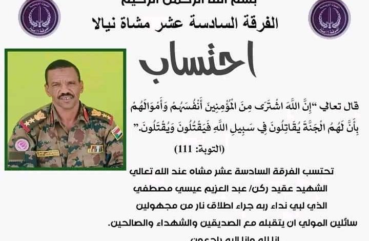 إحتسبت الفرقة السادسة عشر مشاة بنيالا حاضرة ولاية جنوب دارفور عقيد بالقوات المسلحة السودانية الذي لبى نداء ربه جراء إطلاق نار من مجهولين بالقرب من منزله بحي عباد الرحمن بمدينة نيالا امس “الاحد”.