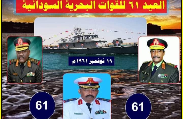 إحتفلت القوات البحرية السودانية بعيدها الحادي والستين وقد هنأ سيادة اللواء بحري ركن محجوب بشرى أحمد رحمة ضباط وصف وجنود القوات البحرية وقدامى المحاربين بأسمى آيات التهاني والتبريكات ، وأطيب الأماني بمناسبة العيد الحادي والستين للقوات البحرية السودانية ، متمنيا للبلاد وشعبها الأمن والإستقرار والنماء ، والقوات البحرية أكثر قوة وتطورا ومنعة ، سائلا الله عز وجل قبولا ورحمة واسعة للشهداء وعاجل الشفاء للجرحى والمصابين والنصر والتجلي لقواتنا المرابطة في الحدود والثغور