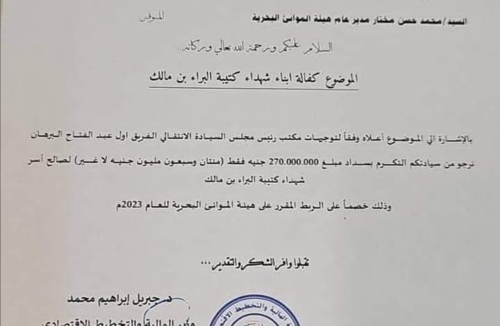 نفت وزارة المالية والتخطيط الاقتصادي ما تم تداوله حول توجيهات وزير المالية دكتور جبريل إبراهيم للموانئ البحرية تخصيص 270 مليون جنيه الكفالة إسراء شهداء كتيبة البراء بن مالك.