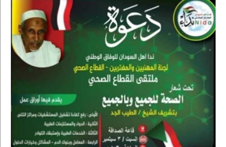تعقد لجنة المهنيين والمغتربين القطاع الصحي لمبادرة نداء اهل السودان للوفاق الوطني ملتقى القطاع الصحي في الثامنة والنصف من صباح غد السبت بقاعة الصداقة وذلك بتشريف رئيس المبادرة الشيخ الطيب ود بدر.