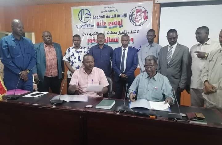 وقعت حكومة ولاية شمال دارفور وشركة ”جي سيستم إنترناشول“ اليوم (الإثنين) بمقر حكومة الولاية بالفاشر عقدا لإنشاء وتشغيل محطات مياه وكهرباء تعمل بالطاقة الشمسية بمحليات أم كدادة والكومة و مليط وكبكابية و كتم سرف عمرة.