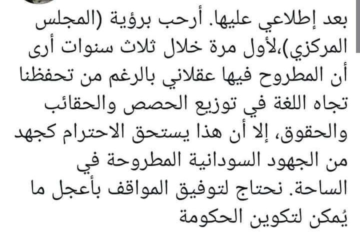 وأضاف أن هذا يستحق الاحترام كجهد من الجهود السودانية المطروحة في الساحة وقال : نحتاج لتوفيق المواقف باعجل ما يمكن لتكوين الحكومة.
