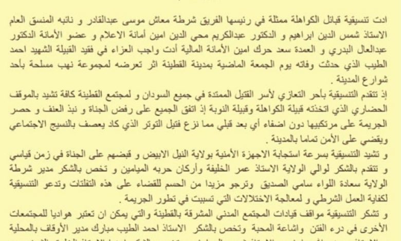 لكفاية العمل الشرطي و لمعالجة الاختلالات التي تسببت في تطور الجريمة . و تشكر التنسيقية مواقف قيادات المجتمع المدني المشرقة بالقطينة والتي يمكن ان تعتبر هواديا للمجتمعات الأخرى في درء الفتن واشاعة المحبة وتخص بالشكر الاستاذ احمد الطيب مبارك مدير الأوقاف بالمحلية و الاستاذ عوض الله عارف و الاستاذ شمس المعارف و تخص بالشكر ايضا الاستاذ الخلوق الشيخ عبده