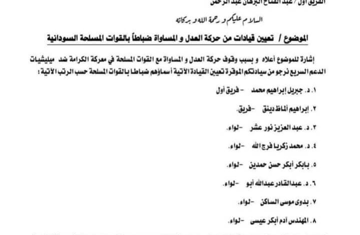 وكانت وسائل التواصل الاجتماعي تداولت خطابا يحمل شعار حركة العدل والمساواة ممهور بتوقيع دكتور جبريل ابراهيم معني لرئيس مجلس السيادة بتعيين دكتور جبريل فريق أول وابراهيم الماظ برتبة فريق وعبد العزيز عشر برتبة لواء وخمسة اخرون في قيادة الحركة برتب لواءات في الجيش