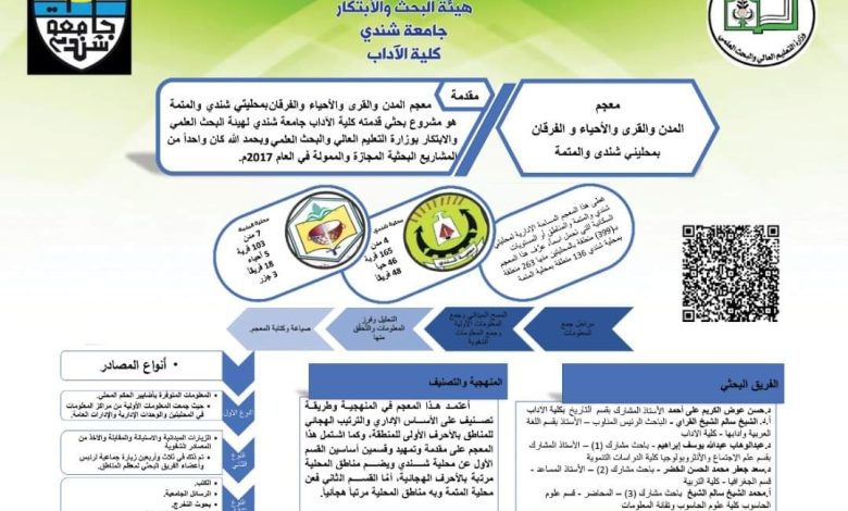 واختارت إدارة البحث العلمي والابتكار بوزارة التعليم العالي و البحث العلمي مشروع (معجم المدن والقرى والاحياء والفرقان بمحليتي شندي والمتمة ) واحداً من أفضل خمس مشاريع بحثية وسيعرض ضمن مخرجات الإدارة لهذا العام عن لجنة العلوم الانسانية في ملتقى مخرجات البحث العلمي الثاني المقام بالوزارة في الفترة من 26- 28 ديسمبر الجاري والذي يعرض أفضل خمس مشاريع بحثية سترشح افضل ثلاثة بحوث منها لجائزة مالية. ويضم الفريق البحثي للمشروع كل من الدكتور حسن عوض الكريم الأستاذ المشارك بقسم التاريخ بكلية الآداب والبروفسيور الشيخ سالم القراي الاستاذ بقسم اللغة العربية بكلية الآداب والدكتور عبد الوهاب عبد الله يوسف الأستاذ المشارك بقسم علم الاجتماع والانثربولوجيا بكلية الدراسات التنموية والدكتور سعد جعفر محمد الحسن الأستاذ المساعد بقسم الجغرافيا كلية التربية والأستاذ محمد الشيخ القراي المحاضر بكلية علوم الحاسوب.