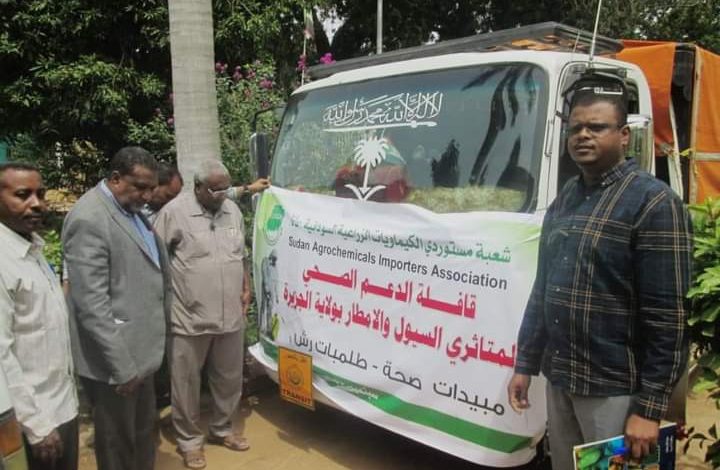 من جانبه أعلن المهندس أسامة فاروق عضو شعبة مستوردي الكيماويات الزراعية السودانية في تصريح صحفي أن الدعم يأتي ضمن المسئولية المجتمعية للشعبة تجاه المتأثرين بالسيول والأمطار، موضحا أن القافلة تحتوي على 1013 لتر من مختلف المبيدات و65 طلمبة ظهر و640 ناموسية وطلمبة ضبابية، مؤكدا إستمرار دعم الشعبة للمتأثرين بالسيول والأمطار بالولاية .