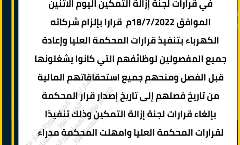 أصدر قاضي المحكمة العليا المختص بالنظر في قرارات لجنة إزالة التمكين اليوم الاحد، قراراً مُلزماً لشركات الكهرباء بتنفيذ قرارات المحكمة العليا وإعادة جميع المفصولين لوظائفهم التي كانوا يشغلونها قبل الفصل ، ومنحهم جميع استحقاقاتهم المالية من تاريخ فصلهم إلى تاريخ إصدار قرار المحكمة بإلغاء قرارات لجنة إزالة التمكين ، تنفيذاً لقرارات المحكمة العليا ، وامهلت المحكمة مدراء شركات الكهرباء بوضع القرار موضع التنفيذ في موعد لايتجاوز الـ25 من يوليو الحالي.