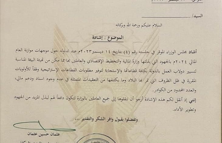 مجلس الوزراء السوداني يشيد رسمياً بجهود العاملين بوزارة المالية إبان الفترة الماضية