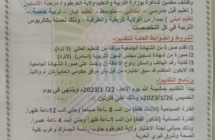 وظائف معلمين شاغرة بوزارة التربية والتعليم الخرطوم